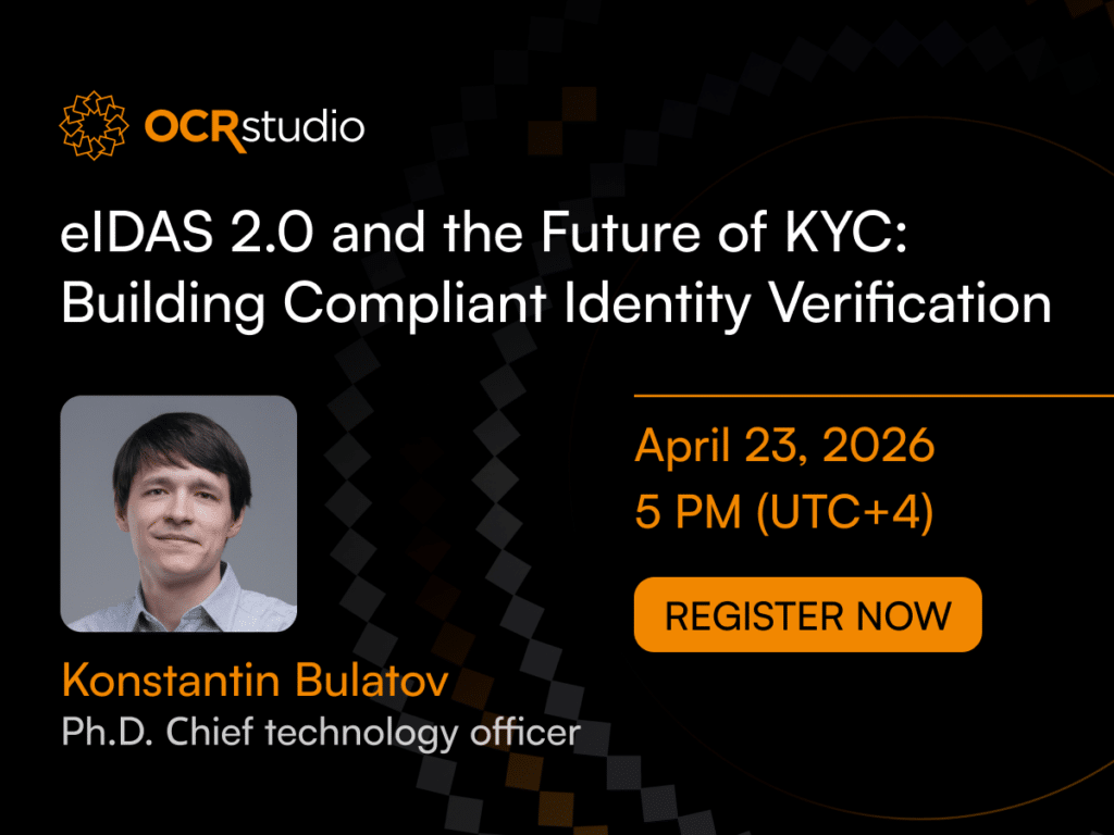 In this webinar, we’ll break down the key principles of eIDAS 2.0 and show how they translate into real-world identity verification flows. You’ll learn what a compliant KYC process looks like in practice and how organizations can build their own onboarding systems using OCR Studio technologies — from document capture and data extraction to verification and fraud prevention — without relying on third-party providers, while maintaining full control over data and infrastructure.